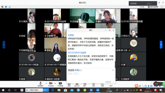 为深入学习贯彻习近平新时代中国特色社会主义思想和党的十九大精神,推动“不忘初心、牢记使命”主题教育走深走实,新捕京3522com学生党支部于7月1日在腾讯会议组织开展了“牢记初心使命,争当出彩先锋”主题党日活动。学生党支部书记李依,团委老师刘莅原以及全体学生党员参加会议,会议由仇庭慧主持。